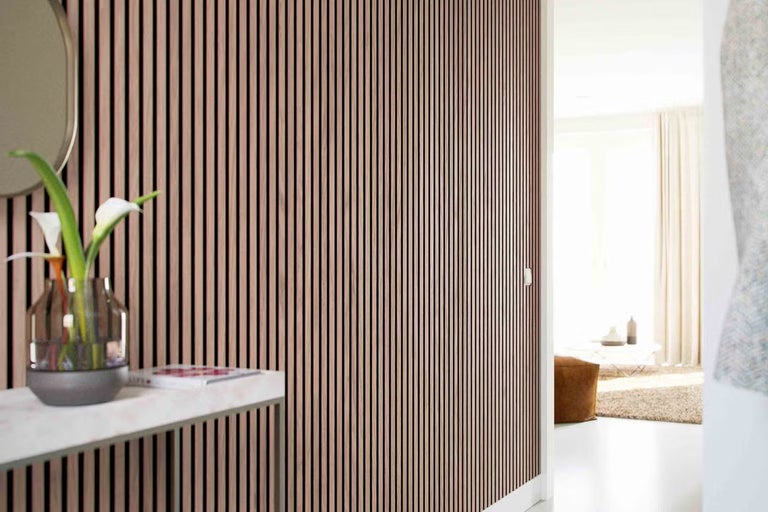 Svoju šatňu môžete ľahko osvetliť pomocou špeciálnych LED pásikov alebo svietidiel navrhnutých špeciálne pre lamely akustických panelov. Nepriame osvetlenie dodáva drevu ešte teplejší a kvalitnejší vzhľad.